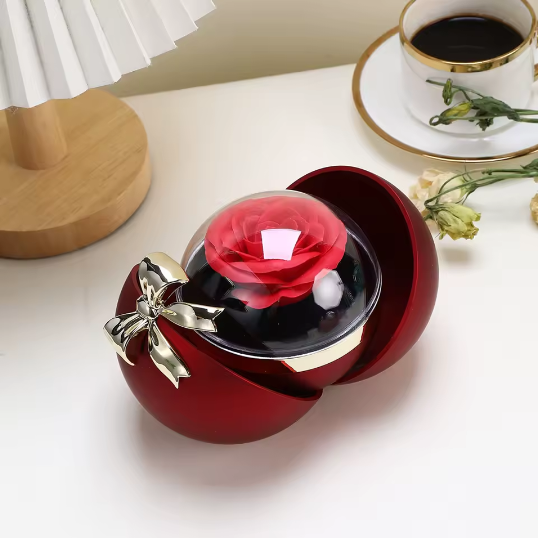 Una rosa eterna, símbolo de amor que no se marchita, cuidadosamente protegida en su cúpula.